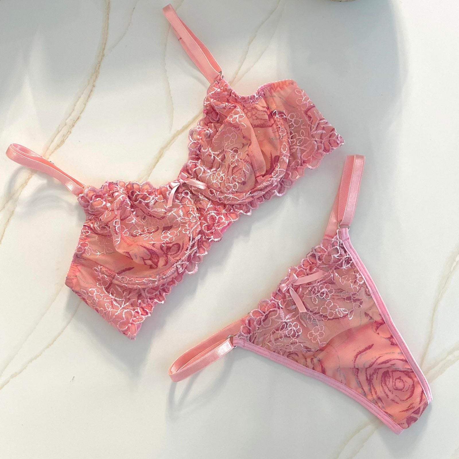 Sumérgete en un mundo de belleza floral con nuestro Set Isara, este conjunto es una combinación  donde el encaje de flores en rosa se alinean con la comodidad y la sensualidad. Experimenta la magia de la feminidad en su máxima expresión. Las flores bordadas en rosa suave sobre la maya tex crean un diseño exquisito que es tanto delicado como apasionado. El bralette cuenta con varillas cuidadosamente diseñadas que realzan y...